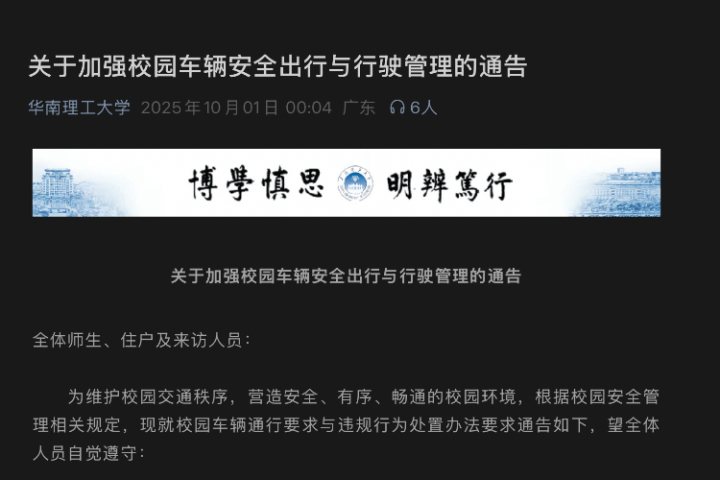 南都讯10月1日,华南理工大学发布《关于加强校园车辆安全出行与行驶管理的通告》。其中提到:为维护校园交通秩序,营造安全、有序、畅通的校园环境,根据校园安全管理相关规定,现就校园车辆通行要求与违规行为处置办法要求通告,望全体人员自觉遵守。